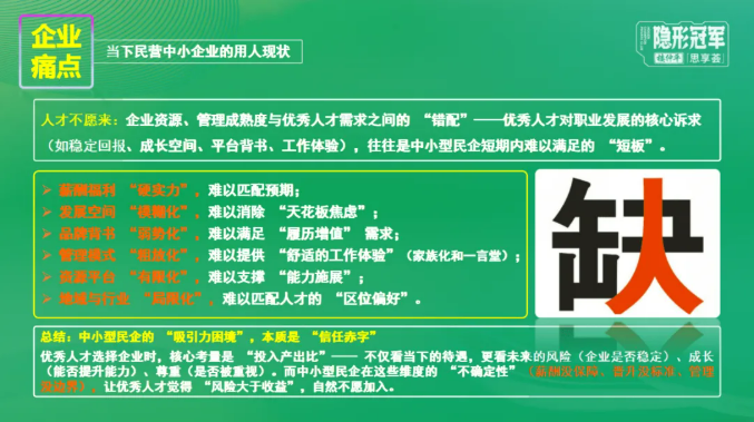 李老師首先拋出一個根本性(xìng)問題:什麽是人才?他指出,真正的人才,是能夠持續創造價值的人。他進一步(bù)分析了當前民營中小企(qǐ)業(yè)麵臨的核心用人困(kùn)境:人才難以吸引、來了(le)難以發(fā)揮作用。