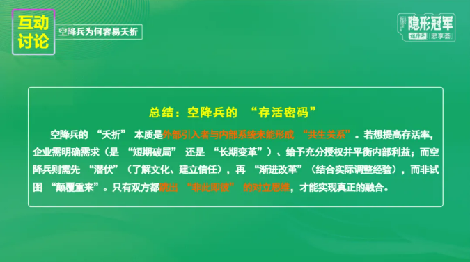 他還分析了“內部(bù)選拔”與“外部招聘”的(de)優劣勢及適用場景,強調企業應基於發展階段靈(líng)活選(xuǎn)用策略。針對“空降兵”這一典(diǎn)型現(xiàn)象,李老師指出成功的關鍵在於立(lì)“共生關係”:前三個月(yuè)應多(duō)觀察、少主導,以技術專長(zhǎng)協助其他部門,逐(zhú)步建立信任、推動(dòng)變革,最(zuì)終實現團隊融合。