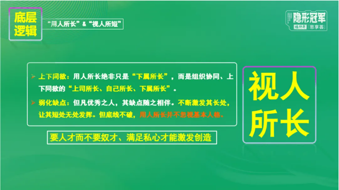 解決(jué)了(le)選人問(wèn)題,那如何讓(ràng)人才發揮該有的作用呢?李二橋老師(shī)隨即分享了雙(shuāng)童的用人理念,為學員提供了具有(yǒu)實踐意義的參考。.17c嫩嫩草色视频的核心用(yòng)人原則是“以德為先(xiān),適我用者為才”,強調內部培養為主、外部引(yǐn)進為輔,既重視經驗積累,更看重實際能力與成果輸出。