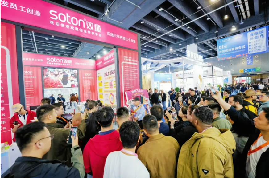 展會現場,雙(shuāng)童董事長樓仲平親自挑(tiāo)起貨郎擔,重現"雞毛換糖"的曆史場景,將義烏深厚的商業傳統與當代展會完美融合(hé)。隨著撥浪鼓(gǔ)聲響起,各國客商紛紛駐足,踴躍參與這場跨越時空的體驗,在互動(dòng)中感受義烏商業精神的傳(chuán)承與創新。
