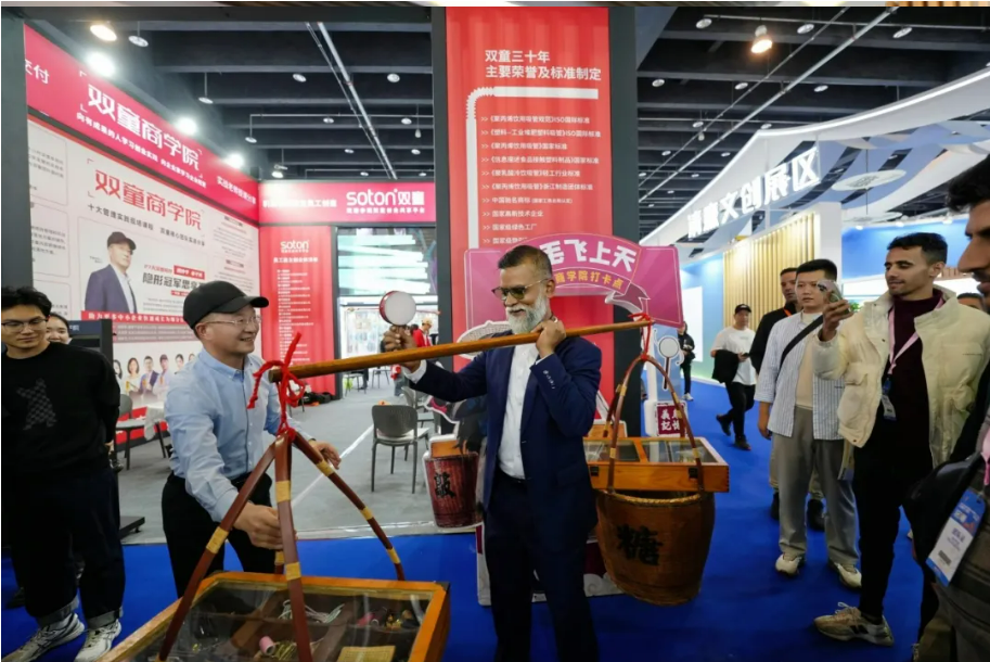 展位外,樓仲平“重拾”老本行,化身賣貨郎,肩挑扁擔,手搖撥浪(làng)鼓,重現“雞毛(máo)換糖”的(de)經典場景。各國參展商客紛紛加入(rù)體驗,或拍照留念,或親手嚐試,仿佛穿越回那個走街(jiē)串巷(xiàng)的創業年代,現場一片(piàn)歡騰。