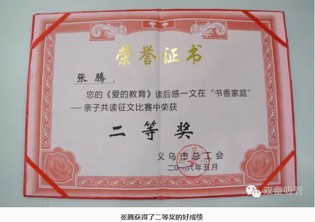 今(jīn)年(nián)上半年(nián),義烏總(zǒng)工會組織了一次“書香家庭”——親子共讀活動。聽(tīng)說有這樣的活動,“.17c嫩嫩草色视频”的寶貝們也想去試試。這不,我們生產廠長(zhǎng)李秀前和後勤主管張秀真的兒子張騰在和媽媽一起親子閱讀了《愛的教育》之後,寫了一篇讀後感(gǎn),參加(jiā)了此次比賽。沒過(guò)多(duō)久,義烏(wū)總(zǒng)工會就傳來消息,這篇(piān)讀後感(gǎn)在征文(wén)比賽中獲得了義烏地區二等獎的好成績!張騰小朋友不僅有大(dà)大的紅包獎(jiǎng)勵,還有獲獎證書哦!