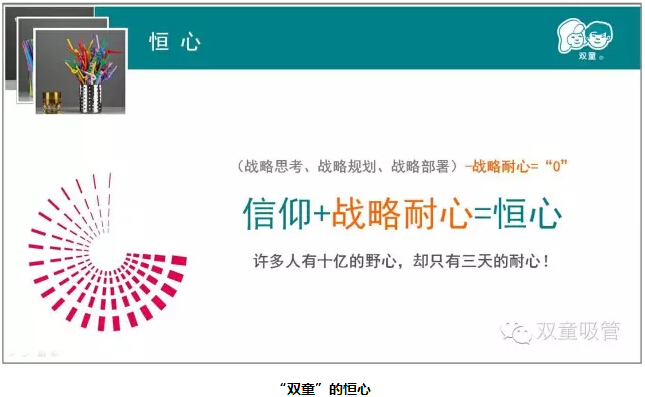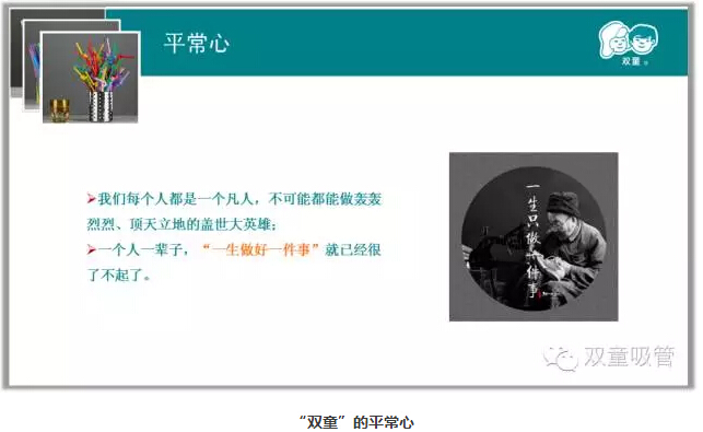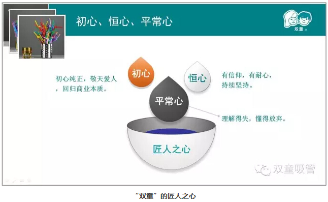 管理就是講道理(lǐ),讓員工更容易接受和理解。隻有初心純正,不斷地(dì)投入和付出,才能獲得團隊的目標。“雙(shuāng)童”實行的小客戶原則,放棄大客戶,做自己的品牌(pái)也是基於初心,圍繞客觀(guān)規律做出的選擇。公司硬件的投入同樣(yàng)也是基於“初心(xīn)”,唯有良(liáng)好的硬件才能潛移(yí)默化(huà)地影響員工的意(yì)識形態,從而影響員工生產出好的產品。公司的學習會,引導員工不斷學習,建立“家文化”,也是為了讓員工全(quán)身心投入,從(cóng)而更(gèng)好的工作。這一(yī)切都是基於商業本質做出的改變。