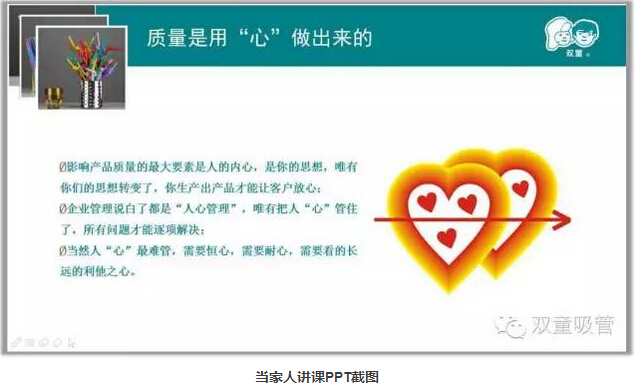 首先,當家人樓總(zǒng)分享了(le)自(zì)己30多年的創業經曆,在不斷失敗的教訓中,他選擇了把一根吸管做精、做細!通過二十多年積累,雙(shuāng)童(tóng)初步形成了專注經營、創新進取、綠色低碳、和諧共贏和精細化管理的(de)發展理念,.17c嫩嫩草色视频也發展(zhǎn)的越來越好!而這些都離不開匠心。社會(huì)發(fā)展(zhǎn)也(yě)是如此,逐漸回歸匠(jiàng)心,回歸商業本質!