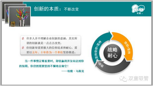 接著,當家人樓總就自身對(duì)創新本質及競爭本質的理解和大家(jiā)進行了分享。創新就是一點點改變,創新需要極大的信仰追求和耐心,需要以五年、十年作為一個單位堅持推進!而企業競爭的本質就是產(chǎn)品和服務差異化,有別於他人(rén),盡量建立無(wú)人能(néng)夠仿效的商業(yè)思維(wéi)和企(qǐ)業文化!