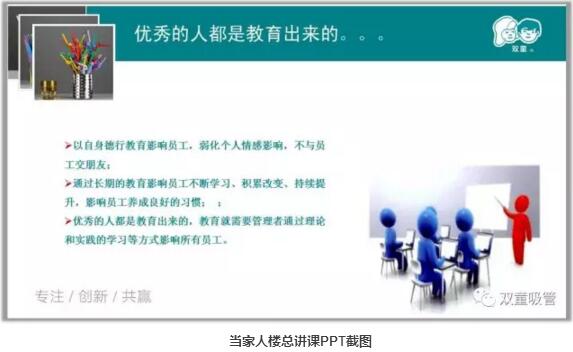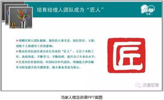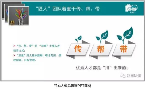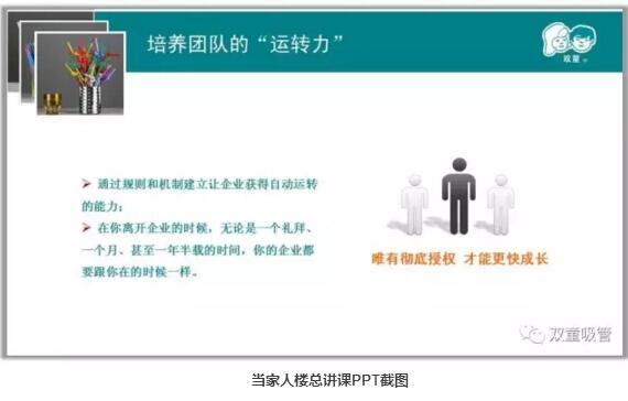 看,當家人樓總的身邊,就坐著二當家李二橋和行政副總吳小彬,無論有什麽事,隨時都可(kě)以展開溝通和討論,通過言傳身教來影響(xiǎng)核心管理層(céng),不僅大(dà)大降低了溝通成本,而且也促進了雙方的互相了解,提(tí)升了辦事效率。
