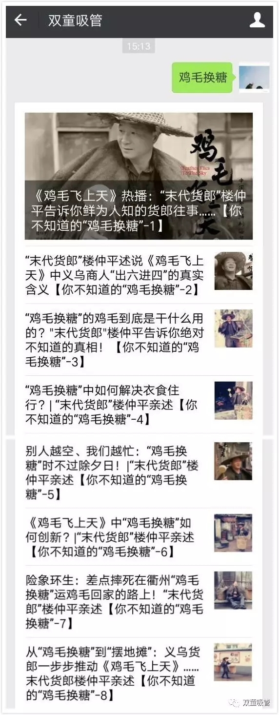 隨著(zhe)《雞毛飛上天》電視劇的熱播,吸管妞結(jié)合了當家人樓總口述的“雞(jī)毛換糖”經曆推出了《你不知道(dào)的“雞毛換糖”》微信係列!目前已(yǐ)經寫到係(xì)列八啦!