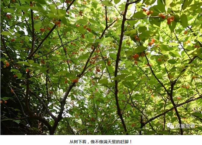 櫻桃樹(shù)上綴滿了(le)待熟(shú)的櫻桃果,在茂(mào)密的櫻葉掩映下慢慢“紅(hóng)了臉”,散發出(chū)陣陣誘人果香(xiāng)。從樹下往上看,像不像星星(xīng)掛滿天(tiān)的趕腳?