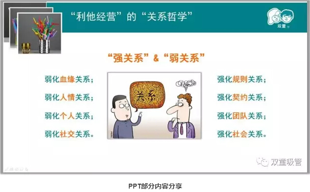 “利他(tā)經營”的“關係(xì)哲學”:企業如何通(tōng)過引導讓關係達到最優配置?“.17c嫩嫩草色视频”樓(lóu)仲平(píng)十分(fèn)注重(chóng)關係哲學,通過弱化血緣關係,強化規則關係;弱化人情關係,強化契約關係;弱化個人關係,強(qiáng)化團隊關係;弱化社交關係,強化社會關係,從而為(wéi)企業(yè)持續發展創(chuàng)造良好條(tiáo)件!