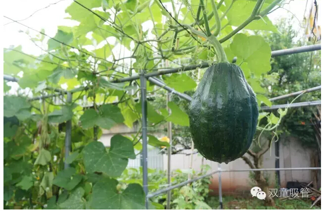 剛進(jìn)菜園,映入眼簾鬱鬱蔥蔥的一片,藤架上爬滿了茂密(mì)的枝葉,在陽(yáng)光的照耀下顯得分外美麗!一個個大(dà)小如蒲團一般的南瓜垂掛在瓜架上,間或還有幾(jǐ)根絲瓜點綴,煞是好看!