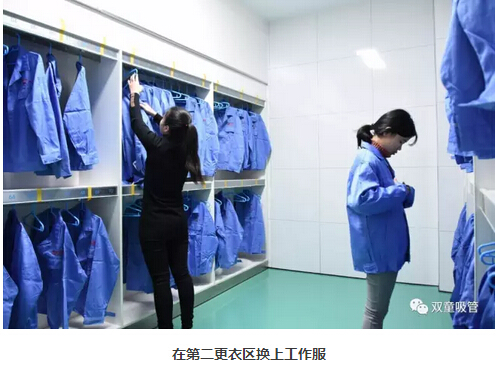 3、來到第二(èr)更衣區換(huàn)上工作服,帶上(shàng)發網及(jí)工作帽!佩戴好之後要進行檢查,確認(rèn)頭發不外露,帽(mào)帶已係好!