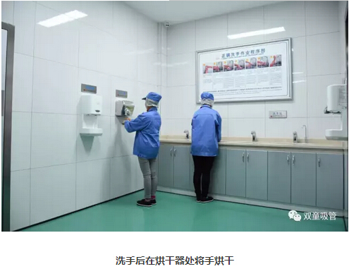 4、整(zhěng)理完衣物(wù)後,來到洗手消毒(dú)間,進行洗手、烘幹、消毒。