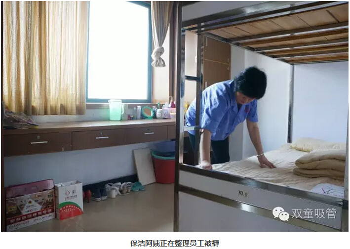 例如,每層寢室樓(lóu)都配有專門打掃衛生的阿姨,進行衛生間和寢室的日常打掃。保潔阿姨會(huì)將所有員工寢室的窗戶、衛生間甚至垃圾桶等各個角落都擦拭幹淨,垃圾不留(liú)過夜,就連員工(gōng)的被褥每天也有阿姨進行整理。