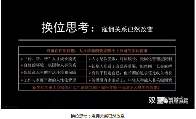 樓仲平通過(guò)總經理李二橋以及吸管妞周上的案(àn)例分(fèn)享了新(xīn)時代(dài)背景下雇傭關係已然改變。以李二橋為主的老一代員工追求(qiú)回報、注重奉獻;尊重權威、聽從安排;尊重(chóng)主流、嚴以律己、隨遇而安。而以吸管妞為主的新一代90後員工注重自我、平等和自由,蔑視權威、追求個性、生活和快樂。所以,企業(yè)要改變組織原有的立場,通過引導並管理員工(gōng)的(de)期望和能力,通(tōng)過對話、承諾和目標進行績效激勵的管理,從而發揮個人(rén)潛力,滿足個人成(chéng)就,實現組織目標和社會價值(zhí)!