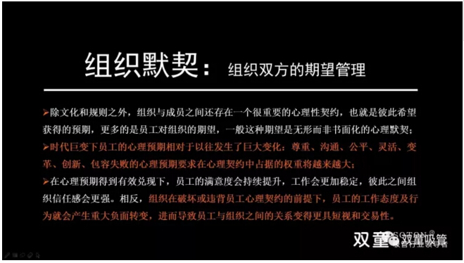 除了(le)文化和規(guī)則之外,組織與成員之間還存在一個很重要的心(xīn)理性契(qì)約,也就是彼此希望獲得的預期,更多的是員工對組織的期望。在心理預期(qī)得到有效兌現(xiàn)下,員工的滿意度會持續提升,工作會更加穩定,彼(bǐ)此之間組織信任感會更強。