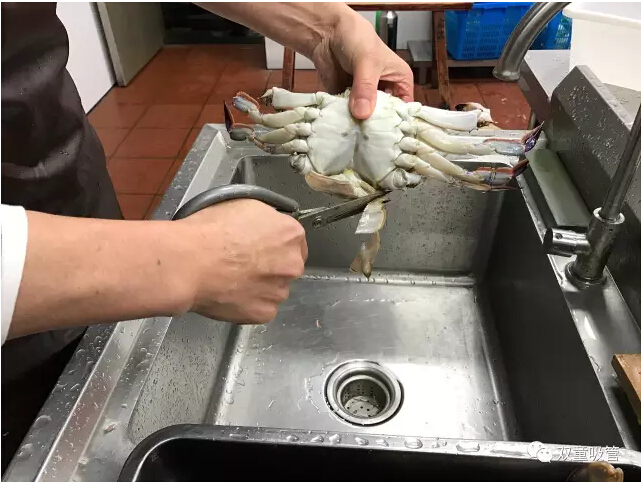 14、再把蟹身切成幾塊。(大點螃蟹切(qiē)分六塊、小一點螃蟹切分四塊)
