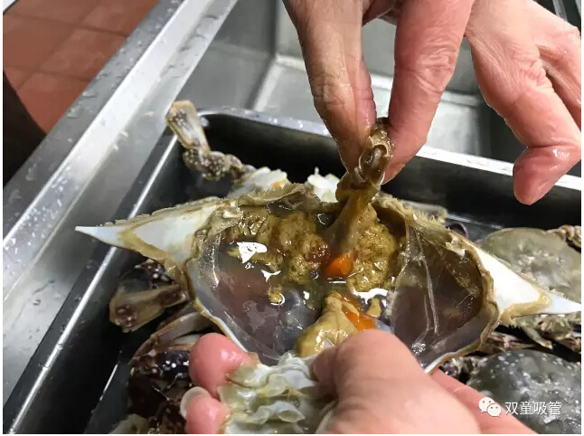 11、一般情況下砂囊會隨膏(gāo)體粘在蟹殼的嘴部,也可能在隨膏(gāo)體粘在蟹身嘴部,反正一定要找到取出!