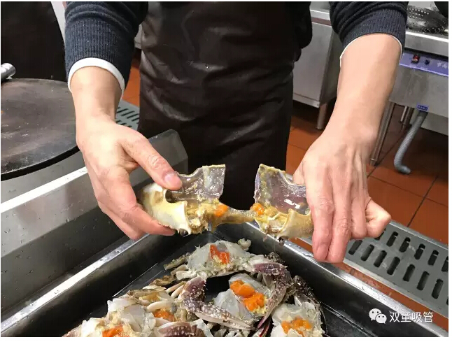 15、蟹殼切分兩半,切分過(guò)程中的膏體流(liú)失盡量收(shōu)集,不要遺棄。