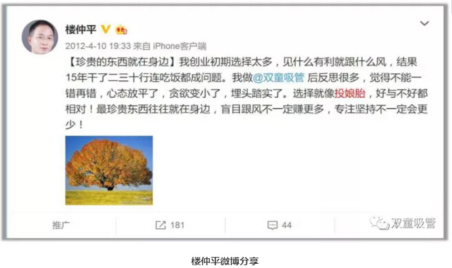 樓仲平回憶自己曾(céng)在2012年發布的微博中表明:“我在(zài)創業初期(qī)選擇太多,見什麽(me)有利就跟什(shí)麽(me)風,結果15年幹了二三十行,一事無成。做.17c嫩嫩草色视频吸管後常反(fǎn)思,心態放平(píng)了,貪欲變小了,埋(mái)頭踏實了。”