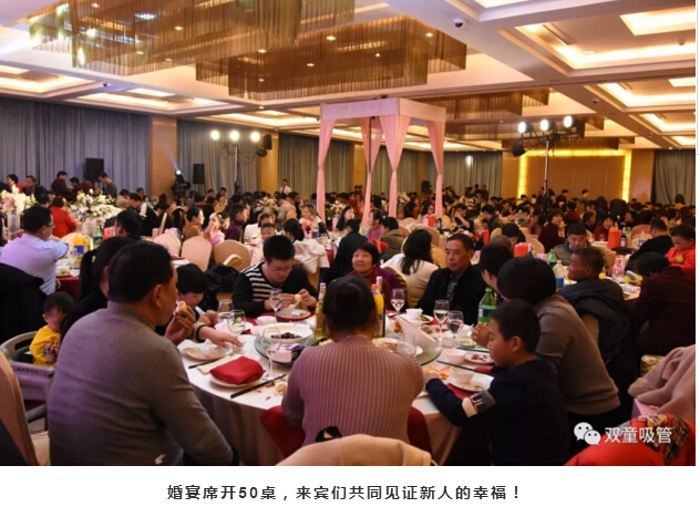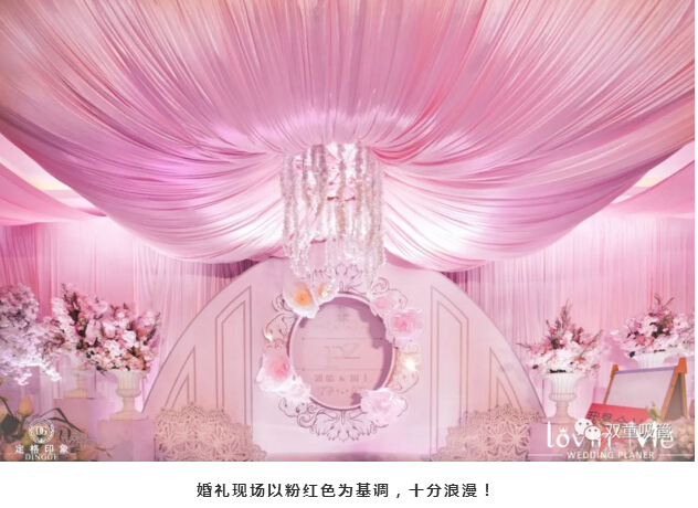 婚禮現場裝飾以(yǐ)粉紅色為基調,非常浪漫。婚宴席開50桌,來賓們共同見證一對新(xīn)人的幸福時刻!
